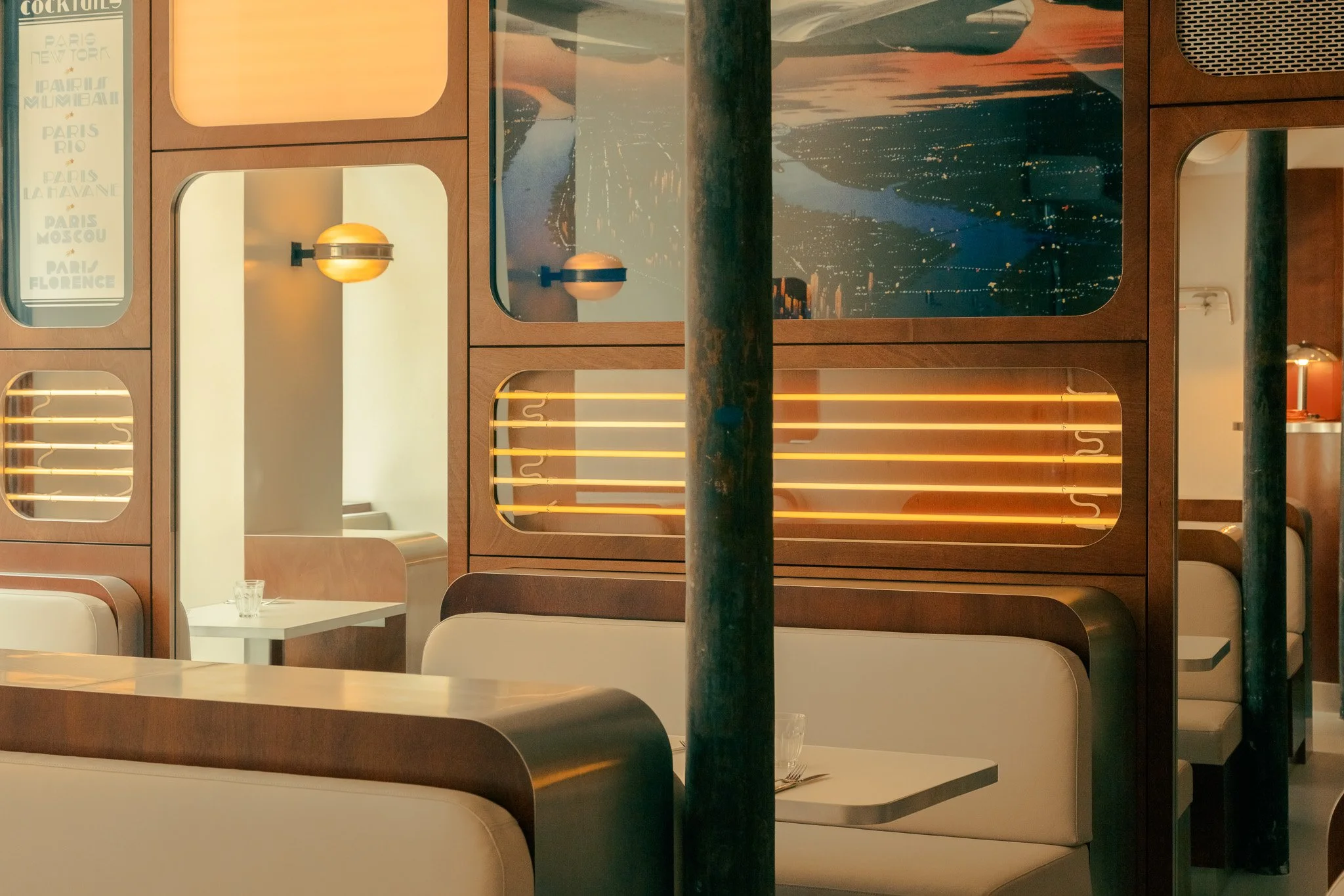 Our creativity nourished with our love for traveling, the idea quickly became to create the fantasied dining car for our new PNY restaurant, inspired both by Wong Kar Wai’s great 2046 movie and our idealized vision of an American mid-century carriage.